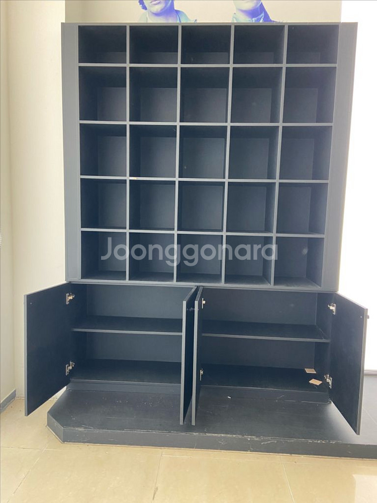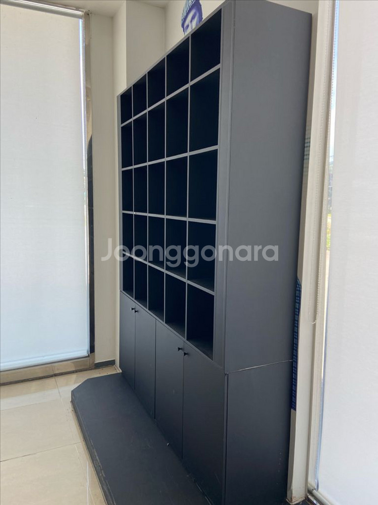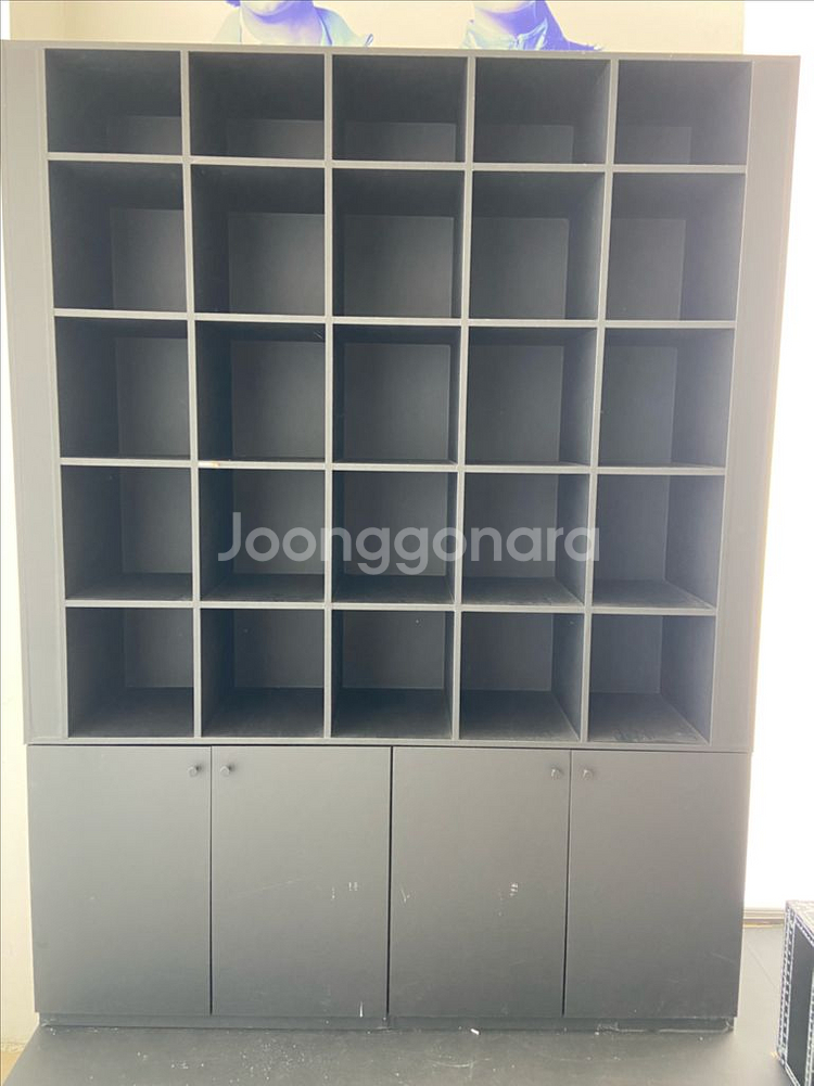 블랙 색상의 수납장 겸 책장입니다. 윗부분은 큐브 모양의 칸막이로 나뉘어 있고, 하단에는 문이 달린 수납공간이 있어요. 깔끔한 디자인으로 다양한 물건을 정리하기에 좋습니다 상단과 분리됩니다 가로 166 세로 220 큐브 가로28 세로 30 폭 30 거래지역 충북청주입니다