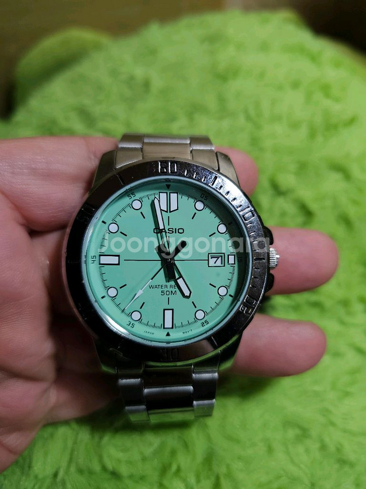 카시오 더콰이즈 스타일 시계입니다. 실버 스테인리스 스틸 밴드에 민트색 다이얼이 특징이에요~ 실착1~2회로 상태최상입니다