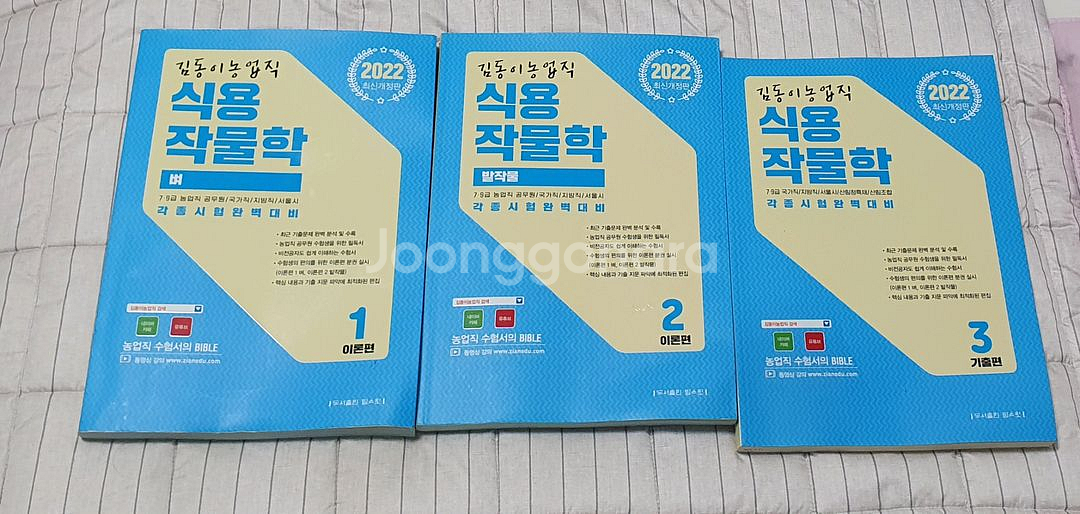 농업직 공무원을 준비하시는 분들 중 식용작물학 과목 시험을 응시하셔야하는 분들을 위한 김동이농업직 식용작물학입니다. 식용작물학 1과 2는 각각 벼와 밭작물에 대한 이론 설명이며, 식용작물학 3은 기출문제를 다루고 있습니다. 현재 식용작물학 1과 3은 완전히 깨끗한 새 책입니다. 그러나 식용작물학 2의 part 4와 part 8은 문제를 풀은 흔적이 있으며, 해당 교재의 part 5 일부분은 문제를 풀은 흔적은 없지만 이론을 공부한 흔적이 있습니다. 세 권이 한 세트로, 개별로는 구매가 어렵습니다. 세 권에 2만 5천원에 팝니다. 가격 부담을 느끼시는 분에게 추천합니다. 참고로 구매는 2021년에 했습니다.