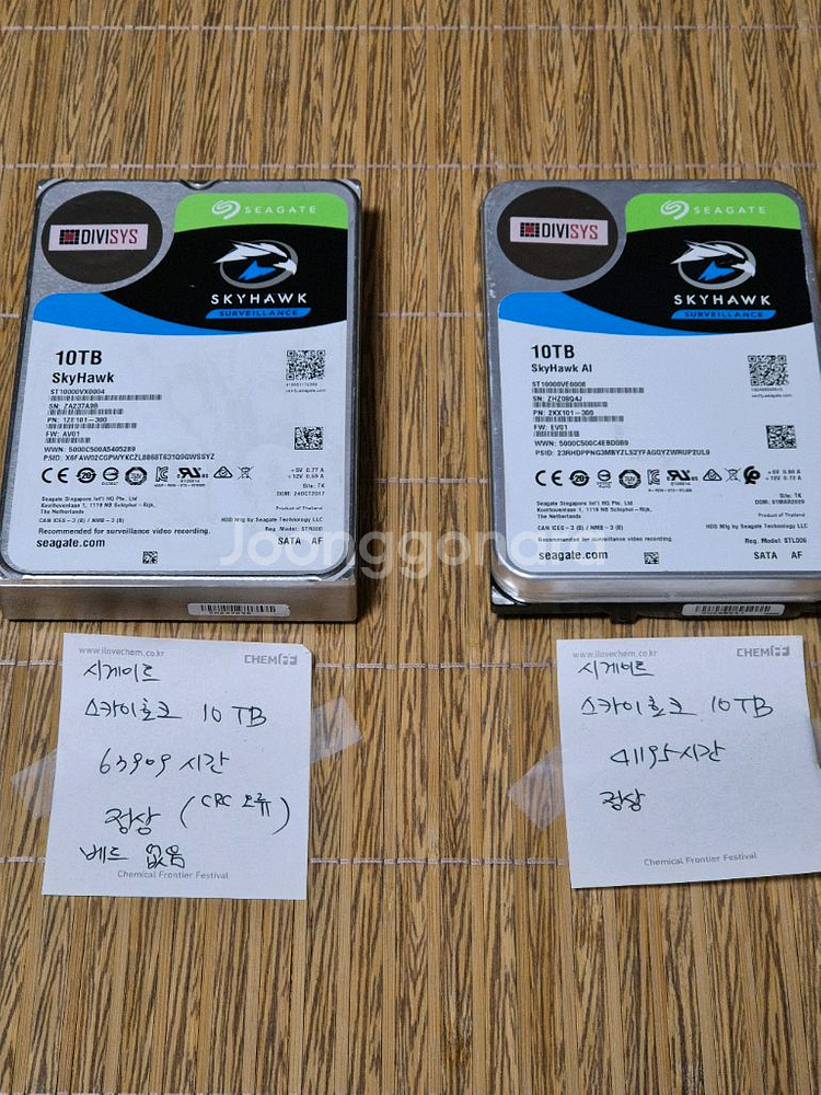 Seagate Skyhawk 10TB 하드디스크 팝니다 각각 테스트 완료했습니다 크리스탈 디스크 인포 (둘다 정상) 하드튠 정상 (둘다 배드섹터 없음) 1번 crc오류 있으나 일반적으로 정상 범주로 봅니다 2개 일괄구매시 22만원에 드립니다 사용 시간: 1번. 63909시간 (1개) -------- 10만원 정상 작동, 배드섹터 없음, crc오류 2번. 41195시간 (1개) --------- 12만원 정상 작동, 배드 섹터 없음 모델 번호: ST10000VX0004-1ZE101 직거래는 경기도 광주, 퇴촌 시간 맞으면 하남 가능합니다 010-4159-8618 * WD Gold 4TB -2개 * WD Enterprise 4TB- 8개 * WD PURPLE 4TB- 1개 * Seagate Skyhawk 2TB- 여러개 필요하시면 문의 주세요