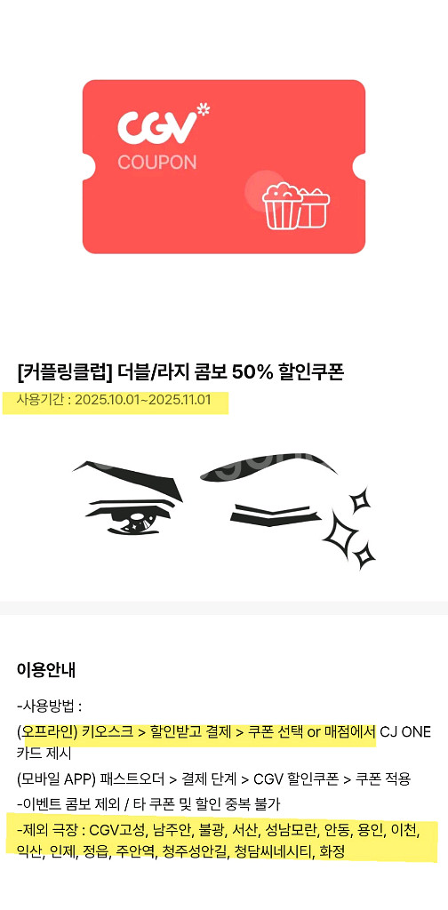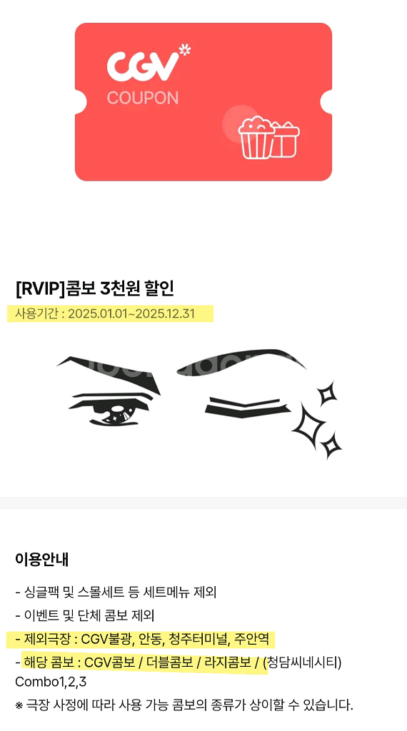 ⛔️상품특성상 바코드 전달 후 교환환불 절대불가⛔️ ✅️ 첨부이미지의 이용안내 및 제외극장 꼭 확인하세요~!!!! ✅️ 여러장도 구매가능합니다 ✅️ 키오스크 없는 지점은 사용가능 영화관 리스트에 있더라도 사용불가입니다 ✅️ 키오스크에서 매점쿠폰사용-cgv쿠폰사용 누르고 적용 <더블/라지콤보 50% 할인권> 유효기간 ~ 25/11/01 1개 3000원 ㅡ 더블콤보/라지콤보 50% 할인가로 구매가능 ㅡ 맛 변경이나 스낵 추가 시 추가되는 금액 포함, 전체에서 반값할인 (많이 주문할수록 당연히 할인액이 더 커짐) ㅡ 단, 스낵추가는 상품추가탭 "함께하면 좋은상품 추천" 단계에서 추가해야 할인적용됨 (별도로 장바구니에 담으면 할인적용 안됩니다!!) ㅡ 첨부이미지의 이용안내, 제외극장 꼭 확인하세요~!!!! <콤보 3천원 할인권> 유효기간 ~ 25/12/31 1개 1000원 2개 1500원 ㅡ cgv콤보/더블콤보/라지콤보 주문 시 사용가능 ㅡ 첨부이미지의 이용안내, 제외극장 꼭 확인하세요~!!!! ⛔️상품특성상 바코드 전달 후 교환환불 절대불가⛔️