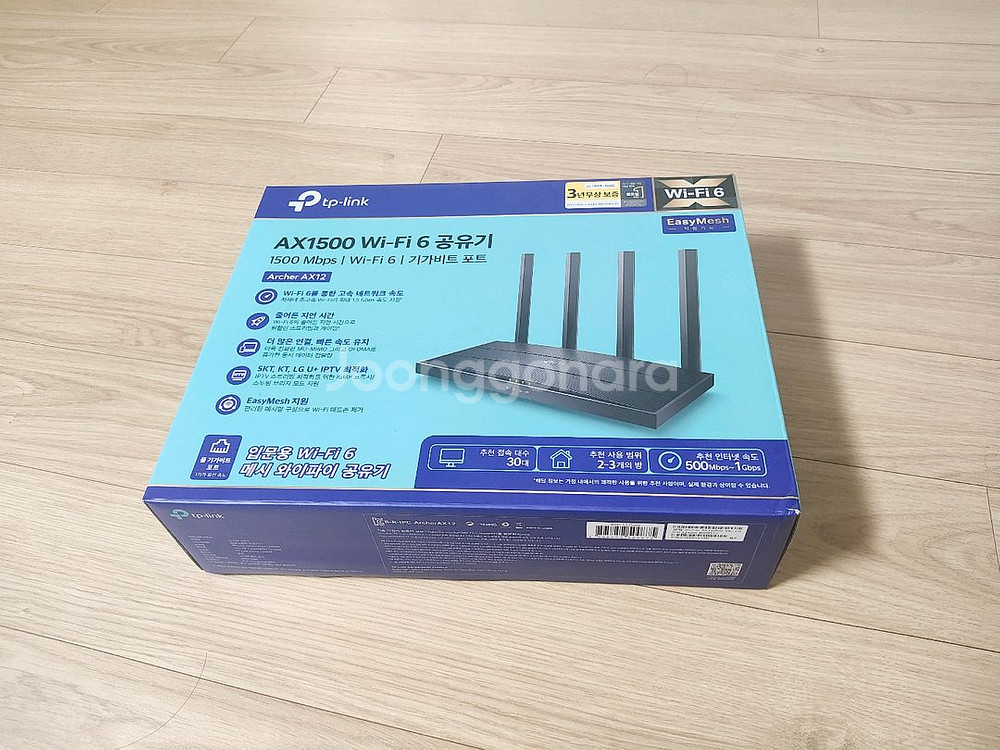 TP-link Archer AX12 와이파이6 공유기 입니다 구성품 다 있는 풀박스 입니다 인터넷 변경하니 통신사에서 공유기를 같이 주더군요 그래서 팔아요 가볍게 와이파이6 써보시면 좋습니다 정상작동 반값은 택포 일반은 2500원+