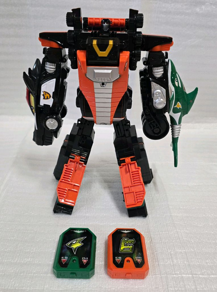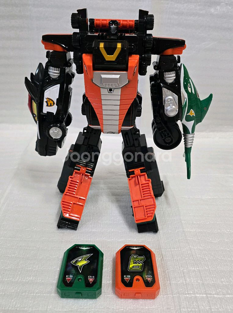 파워레인저 엔진포스 DX 캐리건킹 판매합니다. 캐리게이터 헬멧, 중간에 있는 부품 누락 있습니다. 건퍼드 뒷바퀴 없고, 바르카 눈 스티커 겉부분이 뜯어졌습니다. 그래서 흰색입니다. 부품 분실 외에 깨끗하고, 조인트 이상 없습니다. 엔진소울 4,6번 이상 없습니다. 배송 전 소울 상태 다시 확인하고, 건전지는 새걸로 드립니다. 포장은 파손 없게 해드립니다.