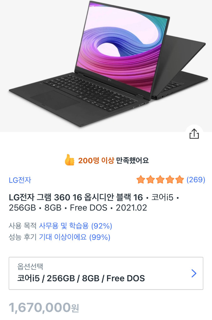 개인정보(거래정보)를 주고받는 행위는 사기에 노출될 수 있으므로 즉시 중고나라로 신고해 주세요LG전자 그램 360 16 옵시디안 블랙 16 • 코어i5 • 256GB • 8GB • Free DOS • 2021.02 + 정품 충전기 , 파우치
