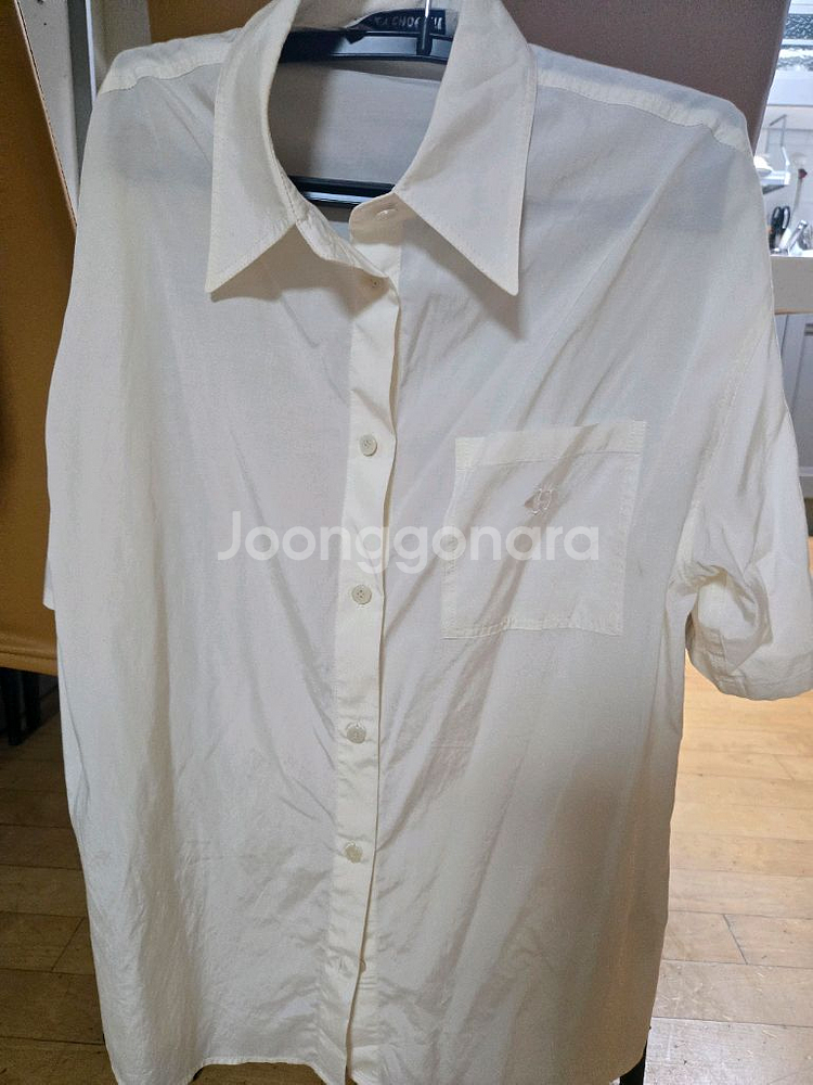 반팔 블라우스입니다. 색상은 화이트이고, 재질은 레이온 54%, 면 31%, 나일론 15%입니다. 제조년월은 25년 1월입니다. 깃에 오염하나보입니다. 그것빼고 깨끗합니다. 딱 한번 입었어요.