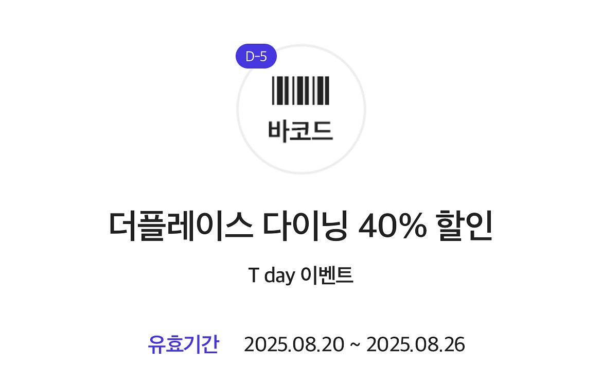 더플레이스 다이닝 40% 할인 📌* 더플레이스 다이닝 매장은 정가 기준 주문 금액 200,000원 한도 안에서 최대 80,000원 할인받으실 수 있습니다. 📌유효기간: 2025.08.26 * 더플레이스 다이닝 매장은 메뉴 구성이 다를 수 있습니다. 쿠폰 사용 방법: 매장 직원에게 쿠폰 제시 * 매장 영업 시간 안에 사용하실 수 있습니다. 입금확인 후 쿠폰 바로 보내드립니다!