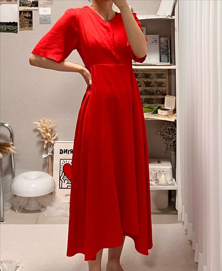 등 뒤는 지퍼로 착용하는 방식이고, 리본 끈으로 묶을 수 있고요. 다홍색에 가까운 레드 컬러로 유니크하고 예쁘답니다. 동남아에서 그네 탈 때 입으면 인생샷 건질 수 있는 하늘하늘한 롱 원피스입니다. 프리사이즈지만 55반까지 착용하면 예쁠 것 같은 S 사이즈 핏입니다.