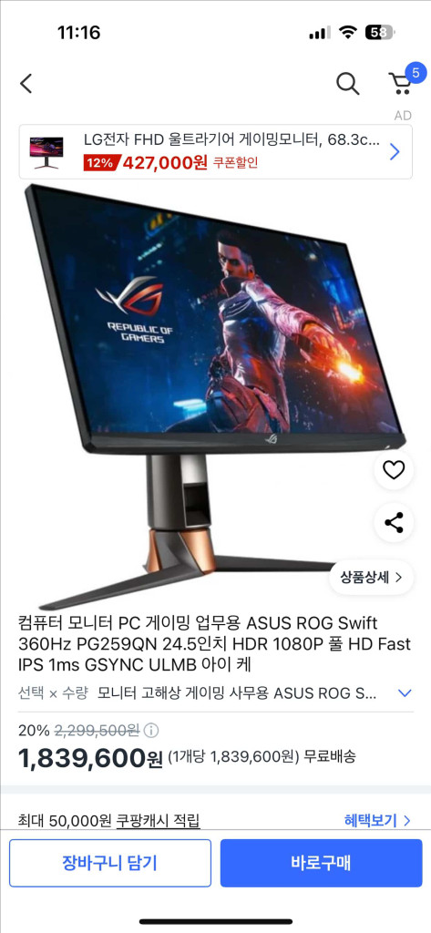 컴퓨토 모니터pc 게이밍 업무용ASUS ROG Swift 360hz PG259QN24.5인치HDR 1080P 풀 HD fast IPS 1ms GSYNC ULMB 1년정도 쓴 모니터 팝니다 하자없고요 구성품 다 있습니다 선,스탠드 있고요 직거래 택배 다 됩니다 거파금 5있습니다 편하게 연락주세요!!