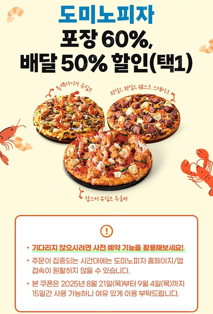 📢 제목에 "제조사/ 브랜드 명"과 "티켓명(ex. 스타벅스 아메리카노 Tall) ”을 넣어 작성하면, 보다 빠른 판매가 가능합니다! 📢 게시글 작성 시 배송 방법에 “직거래”와 “내 위치” 설정할 경우, 보다 빠른 판매가 가능합니다! 📢 내가 가진 커피, 편의점 e쿠폰을 <J쿠폰>에서 간편하고 빠르게 판매가 가능합니다! 2일 이내 판매금을 정산 받아보세요. 총 5장 있어요. 60% 포장쿠폰 or 50% 배달쿠폰 원하시는 종류를 말씀 주시면 원하시는대로 드려요 총 5장 있어요. 아래에 유의사항 확인바랍니다 주문이 집중되는 시간대에는 도미노피자 홈페이지/앱 접속이 원활하지 않을 수 있습니다. 사전 예약 기능을 활용하시면 보다 편리하게 주문하실 수 있습니다. 이 쿠폰은 2025년 8월 21일(목)부터 9월 4일(목)까지 15일간 사용하실 수 있으니 여유롭게 이용 부탁드립니다. 이 쿠폰은 결제 1건당 1개만 사용하실 수 있습니다. 할인 전 주문 금액이 배달비를 제외하고 25,000원 이상일 경우 할인받으실 수 있습니다. 배달 주문 시 최대 25,000원, 포장 주문 시 최대 30,000원 할인받으실 수 있습니다.(주문 금액 정가 기준 50,000원까지 할인 적용) 배달 주문의 경우 배달비 3,000원을 부담하셔야 하며, 배달비는 할인이 적용되지 않습니다. 이 혜택은 T 멤버십 상시 할인/적립 혜택과 같은 날 이용하실 수 있습니다. 단, 결제 1건당 1개 혜택만 받으실 수 있습니다. T 플러스포인트를 사용해 결제하실 수 없습니다. 모든 종류의 피자(M, L)와 사이드디시에 할인이 적용됩니다. 함께 주문하는 콜라, 소스, 토핑도 할인이 적용됩니다. 단, 콜라는 피자 1판당 2개까지 주문하실 수 있습니다. 마이 키친, 인기 세트 메뉴, 해피 데일리 메뉴는 할인이 적용되지 않습니다. 만 14세 이상 고객님만 도미노피자 회원가입을 하실 수 있습니다.(만 14세 미만 고객님은 혜택 이용에 제한이 있을 수 있습니다.) 현장 주문 및 전화 주문은 이용하실 수 없습니다. 매장 오픈 시간은 오전 11시~11시 30분이며, 매장마다 다를 수 있습니다. 주문 시 이벤트 제외 매장을 선택할 경우 [통신사 및 카드사 할인 선택] 화면에서 [SKT 고객 감사제 혜택(배달 50%/포장60%)] 혜택을 선택하실 수 없습니다. 이벤트 제외 매장은 아래 '제외 매장 확인하러 가기'에서 확인해 주시기 바랍니다. ▶ 제외 매장 확인하러 가기 >> https://web.dominos.co.kr/event/viewHtml?seq=2372&gubun=E0200 이벤트 참여 매장은 도미노피자 사정에 따라 변경될 수 있습니다. 배달 및 포장 모두 도미노피자 홈페이지/앱에서 주문과 동시에 결제하셔야 합니다. 당일 주문 건만 할인받으실 수 있으며, 다음 날로 예약하실 수 없습니다. 이벤트 당일 주문이 많으면 대기 시간이 길어질 수 있습니다. 매장에 따라 재료 소진 시 이벤트가 일찍 종료될 수 있습니다. 이 쿠폰은 상품권이나 현금으로 교환하실 수 없습니다. 기간이 지난 쿠폰은 사용하거나 다시 발급받으실 수 없습니다. 할인 금액에 대해 현금 영수증이 발급되지 않습니다. 쿠폰, 제휴 등 다른 프로모션과 중복으로 적용되지 않습니다.(배달비 무료, 할인 쿠폰 등 포함) 온라인 주문 후 취소할 경우 매시 정각과 30분에 취소가 반영됩니다. 따라서 주문 취소 후 다시 주문하시면 약 30분 정도 소요될 수 있습니다. 상품 이미지는 예시로 실제와 다를 수 있습니다. 🚨회원님의 거래 게시글을 노린 중고나라 운영진 사칭 피싱 사이트를 주의하세요🚨