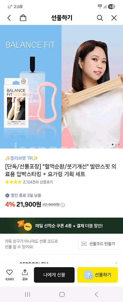 개인정보(거래정보)를 주고받는 행위는 사기에 노출될 수 있으므로 즉시 중고나라로 신고해 주세요올리브영에서 판매하는 발란스핏 의료용 압박스타킹(S)과 요가링 기획 세트입니다 혈액순환과 붓기 개선에 도움을 줄 수 있어요 구매 가격은 21,900원입니다 편의점반값택배로 보내드릴 예정입니다.