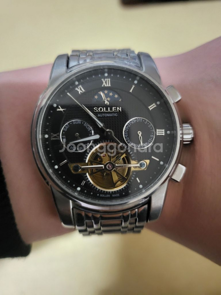 sollen 문페이즈 오토메틱 시계입니다 외관은 사진상으로 확인하시구요 상태 깨끗합니다 36미리 사이즈구요 오버홀 완료해서 오토메틱 컨디션 최상입니다 문페이즈 기능 및 정상작동합니다 줄길이 넉넉합니다 시계단품이며 일반시계케이스에 넣어서 보내드립니다 대구 직거래 환영 중고 특성상 제품하자 외 변심 등으로 인한 교환ㆍ환불 불가입니다