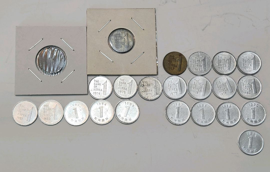 옛날동전, 구형 한국 1원 동전 줄세우기 66년~91년 (전년도 모음) + 4292년 십환 서비스 일원 동전 , 66,67 황동 68년부터 알루미늄 주화 91년 까지 유통용 발행 (71,72,73,86년 미발행)