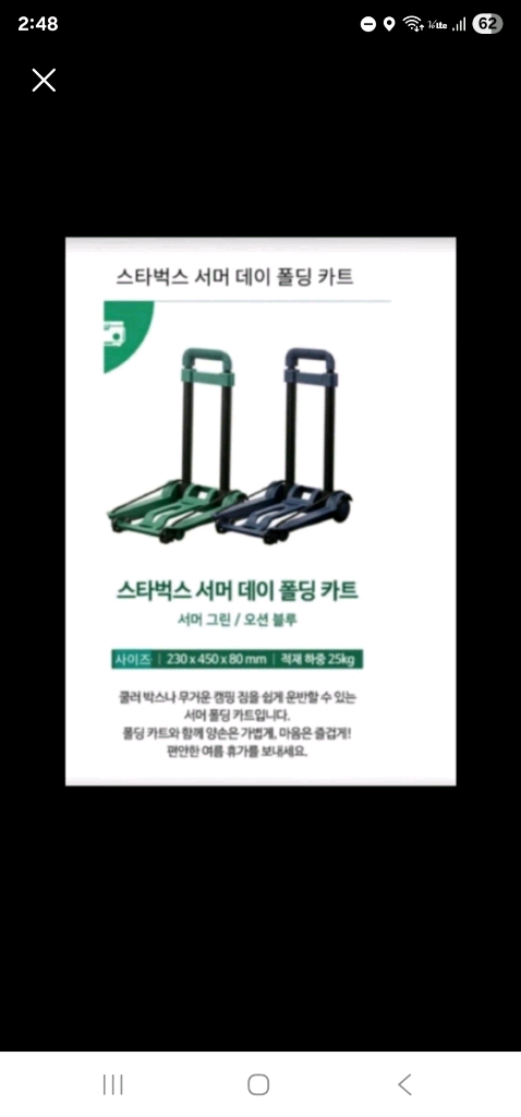 개인정보(거래정보)를 주고받는 행위는 사기에 노출될 수 있으므로 즉시 중고나라로 신고해 주세요스타벅스 서머 데이 폴딩 카트입니다 * 사이즈: 230 x 450 x 80mm * 최대 적재 하중: 25kg * 쿨러 박스나 무거운 짐을 쉽게 운반 스타벅스 폴딩 카트 새상품 색상 그린/블루 택1 한개가격 교환 환불 불가 무료배송