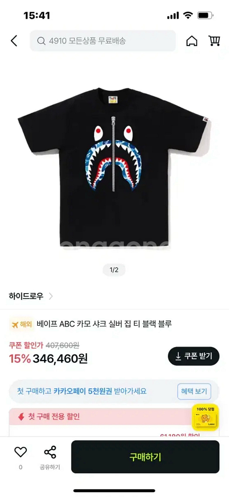 베이프 블루샤크반팔티입니다