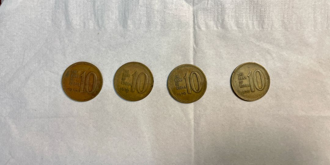 1970년 발행된 10원 짜리 동전입니다. 맨 왼쪽 적동 1개와 나머지 3개는 황동입니다. 사용감 있습니다. 색 비교를 위해 4개를 두었습니다. 맨 오른쪽 황동은 오래전 한번 세척한 것입니다. 가운데 2개는 바래서 붉은기가 돈 것입니다. 맨 왼쪽이 적동입니다. 완전 색이 다르죠? 세트로 우선 팝니다.