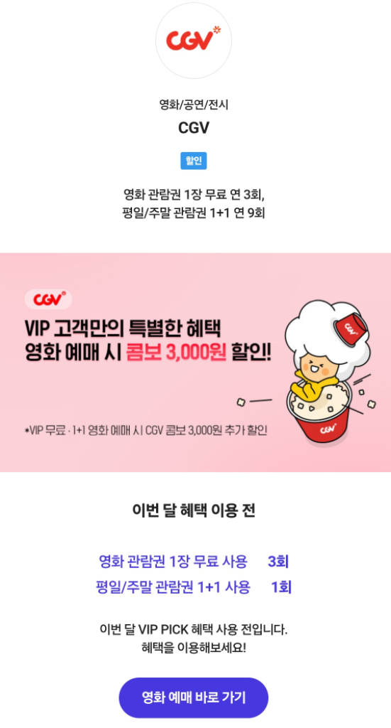 개인정보(거래정보)를 주고받는 행위는 사기에 노출될 수 있으므로 즉시 중고나라로 신고해 주세요2D일반관만 적용됩니당 원하시는 영화의 날짜,시간,자리 알려주세용 입금확인후 예매하고 바로 예매번호 알려드립니다!