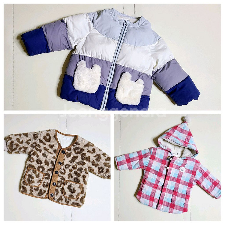 - 다른 게시물에서도 여러 옷들 판매중입니다. 2벌 이상 구매시 조금씩 에눌해드려요. - s 100 5호 등 사이즈 섞여있고 대략 키 80중반~90초반까지 추천해요. 좀더 작거나 큰 옷은 추가 고지해두었습니다. - 대부분 깨끗해요. 오염 등의 고지사항 있는 것들은 추가 사진 찍어두었습니다. 1. 아가방 패딩 100 : 만원, 귀여운 디자인, 아가방 브로치 떨어지면서 가슴에 작은 자국 남았어요(사진참고) 2. 보세 호피자켓 5호 : 7천원, 늦가을~초겨울 두께 3. 블루독 털자켓 100 : 6천, 상큼하고 예뻐요, 떡볶이 단추 하나 분실했으나 내부에 지퍼가 있어 여닫는데 문제 없어요. 사용감 있어요.