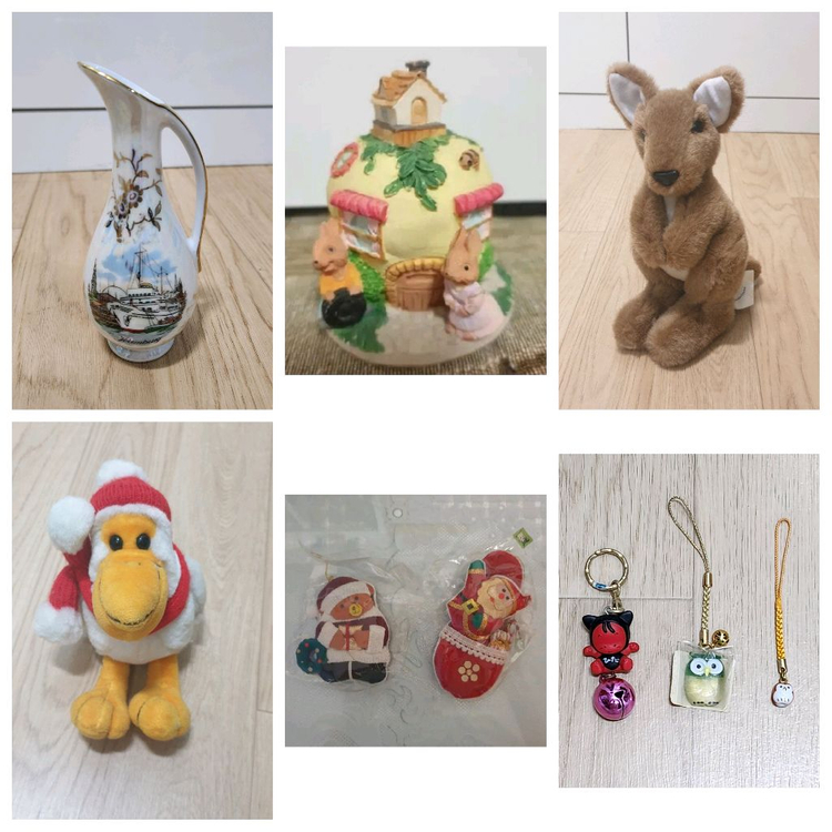 진열만 해두었었습니다 사이즈는 사진에 있습니다 윗줄 1.이태리에서 사온 장식품 25000원 2.토끼마을 8000원 3.시드니에서 직접사온 캥거루인형 1만원 아랫줄 1.펠리칸인형 7000원 2.산타트리장식2개 2000원 3.일본에서 사온 악세사리-하나에 15000원씩 (작은부엉이만 1만원)