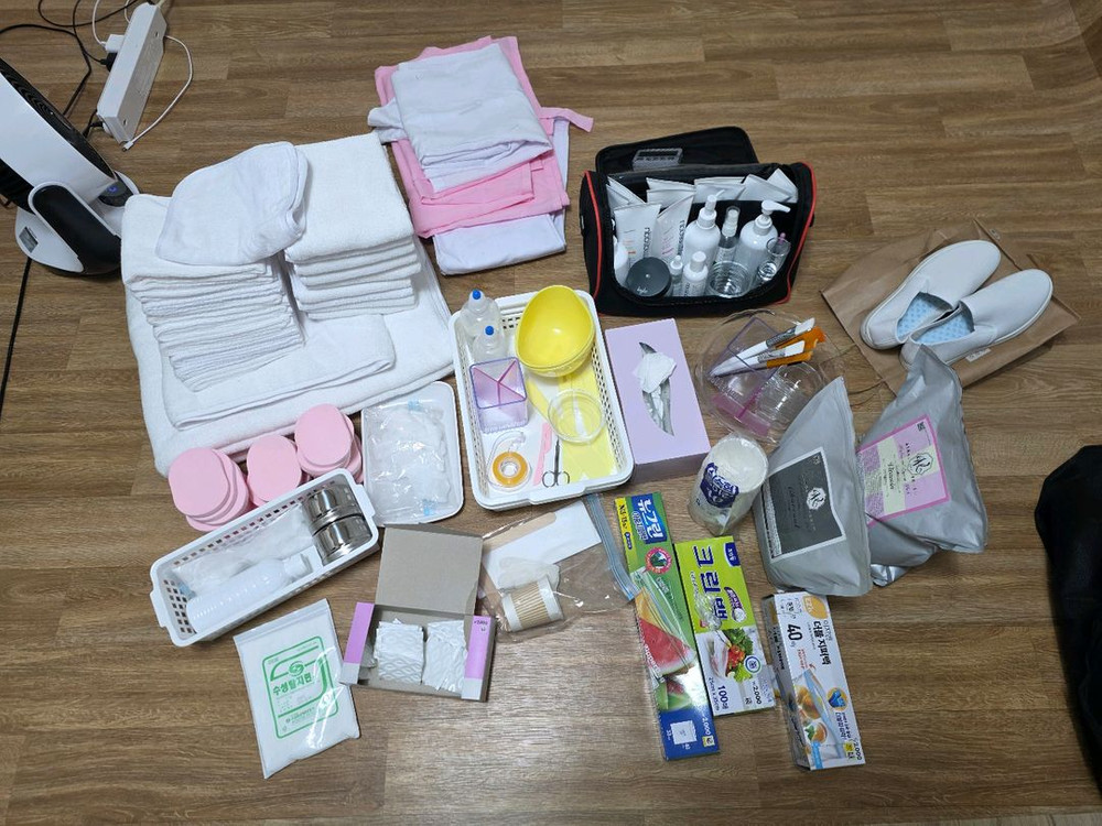 피부 미용 관리 실기 재료 풀세트 일괄 판매합니다 -실기용 대형 검정 가방 -대타올 2장 -중타올 1장 -소타올 18장 -터번 1개 -관리사 가운 1개 (XL) -관리사 백바지 1개 (XL) -관리사 신발 (230) -시술자 치마 1개, 가운 1개 (Free) -해면 20장 -더마사큐 화장품 세트 (전부 절반 이상 남아있습니다) ▶ 스크럽, 영양크림, 마사지크림, 수딩젤, 석고 베이스크림 지성.중성.건성 크림, 고마쥐, 클렌징 로션, 마사지 오일 메이크업 리무버, 토너, 파우더(제모), 아이크림, 아하, 효소 -모델링팩(고무마스크) 1개, 석고마스크팩 1개 (전부 절반 이상 남아 있습니다) -고무볼 2개, 스파츌라 5개, 유리볼 9개, 팩붓 5개, 보관통 2개 눈썹칼, 눈썹 빗, 가위, 거즈, 양주잔 2개, 면봉, 종이컵, 쟁반 화장솜(조금), 지퍼백 2개, 크린백, 탈지면, 제모세트, 각티슈(절반 정도), 스톱워치 택배비는 별도 입니다!