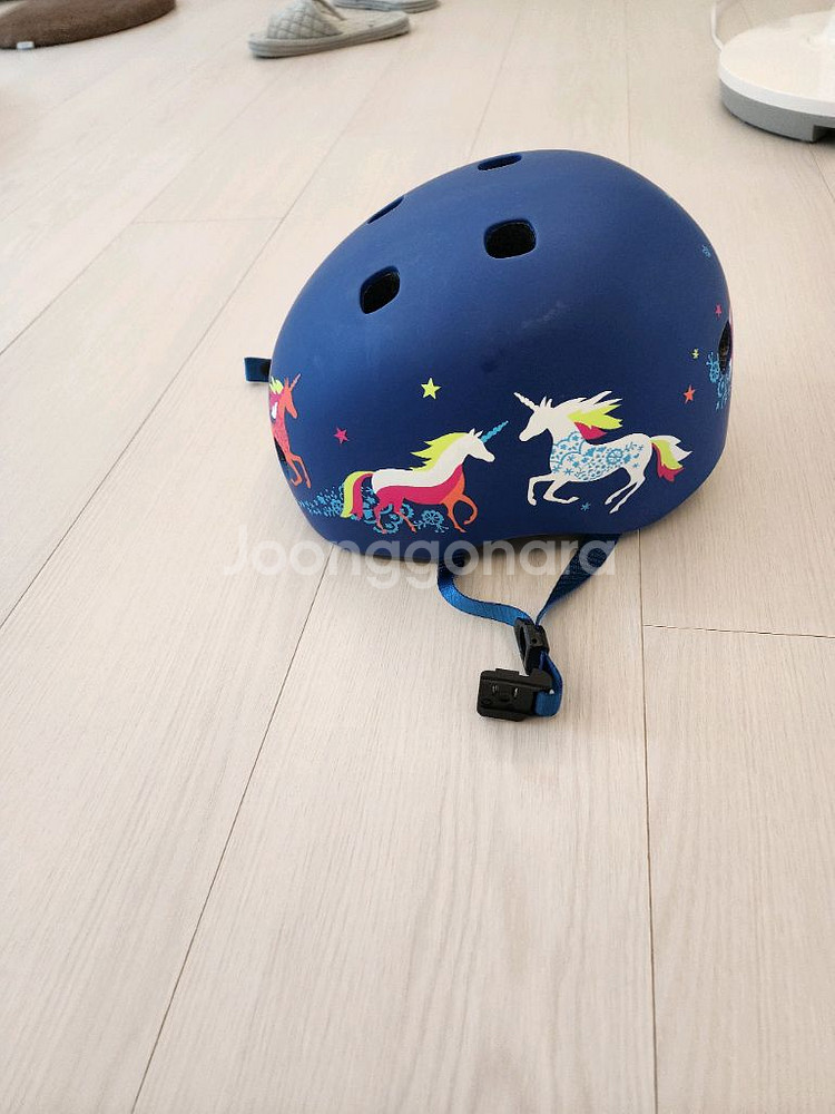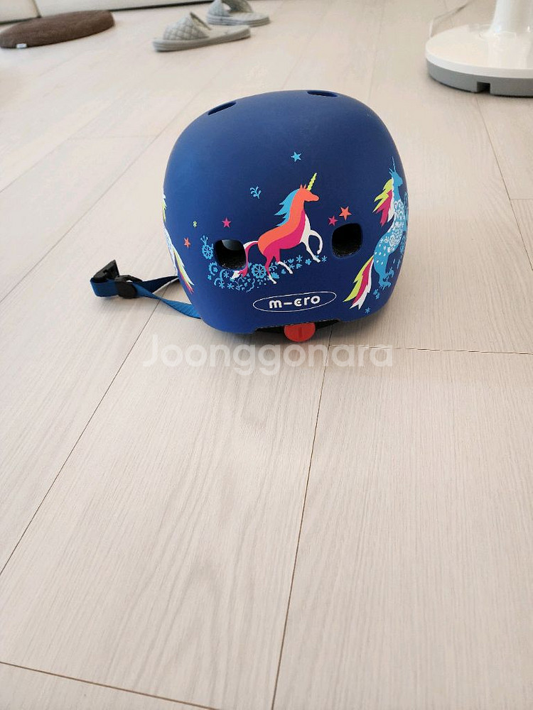 Micro 브랜드 아동용 헬멧과 무릎/팔꿈치 보호대 세트입니다. - 헬멧은 M사이즈고 파란색 바탕에 유니콘 그림이 그려져 있어요 - 헬멧 안쪽에는 머리 둘레를 조절할 수 있는 다이얼이 있습니다