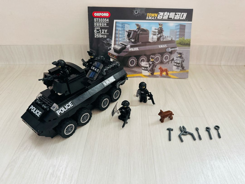 옥스포드 타운 SWAT 경찰특공대 블럭 세트입니다. 모델 번호는 ST33354이고요, 6-12세 권장 연령입니다. 박스 없어요 특공대 방패 하나만 스티커가 떨어졌네요 모든 블럭 갯수 맞아요