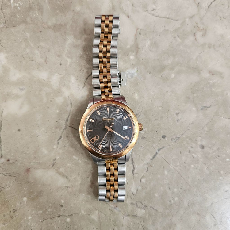 페라가모 정품 m사이즈 금장 시계예요 로즈골드의 예쁜 금장이구 14개의 다이아몬드가 박혀있습니다~ 케이스,여분줄 모두 있습니다 상태 최상입니다 220만원에 구입했던 시계예요
