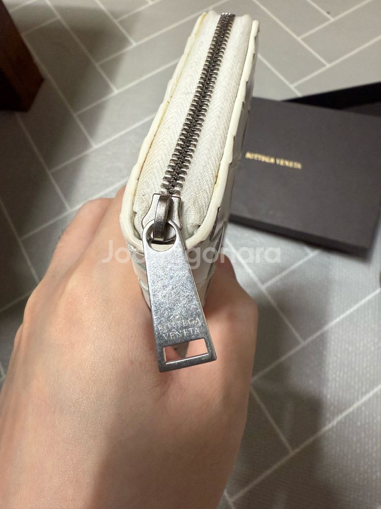 보테가베네타 인트레치아토 카프스킨 레더 실버 지퍼 어라운드 코인 8슬롯 장지갑 화이트 (이름은 실버인데 화이트 색상입니다.) 3년 전 압구정현대에서 200만원 가까이 주고 구매했던 제품입니다. 어머니 선물로 드렸던 제품인데 잠깐 몇번 쓰시고 그대로 방치해둔 상태입니다. 가죽부분 변색이나 오염 없으며 눈에 띄지 않는 작은 찍힘은 있습니다. 지퍼쪽은 흰색 특성상 사용감이 존재하며 사진 최대한 자세히 찍었습니다. 제가 쓰려다가 유광의 화이트 색상이다보니 남자가 쓰긴 부담스러워서.. 취향 맞으시면 남자분이 사용하셔도 좋을 것 같습니다. 현금도 많이 들어가고 카드 수납 공간 8칸에 동전도 보관 가능해서 일본 여행시 편리합니다.
