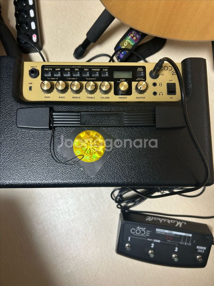 마샬 코드25입니다. 보시다시피 상태는 최상급입니다. 박스도 다 가지고 있습니다. 핸드폰으로 블루투스 연결해서 음악도 들을 수 있고 음악에 맞춰 연주할 수도 있습니다. 나름 재밌게 사용했는데 앰프가 너무 많아서 정리합니다. 연락주세요.
