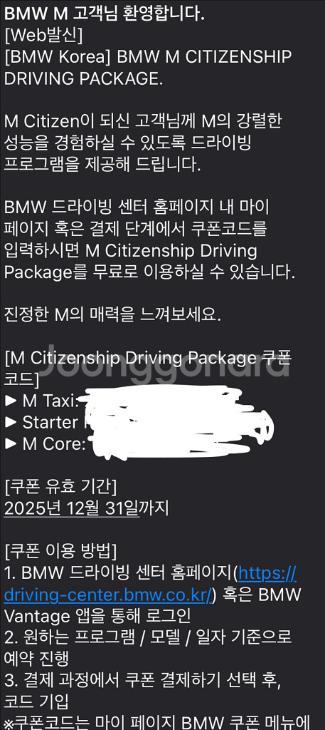 bmw 드라이빙센터 프로그램 쿠폰 3종 M taxi starter pack M core 3종 일괄 판매합니다 30만입니다 쿠폰 번호 전송드려요 온라인 쿠폰 거래 특성상 환불 불가능합니다 유효기간 올해말까지 연락주세요