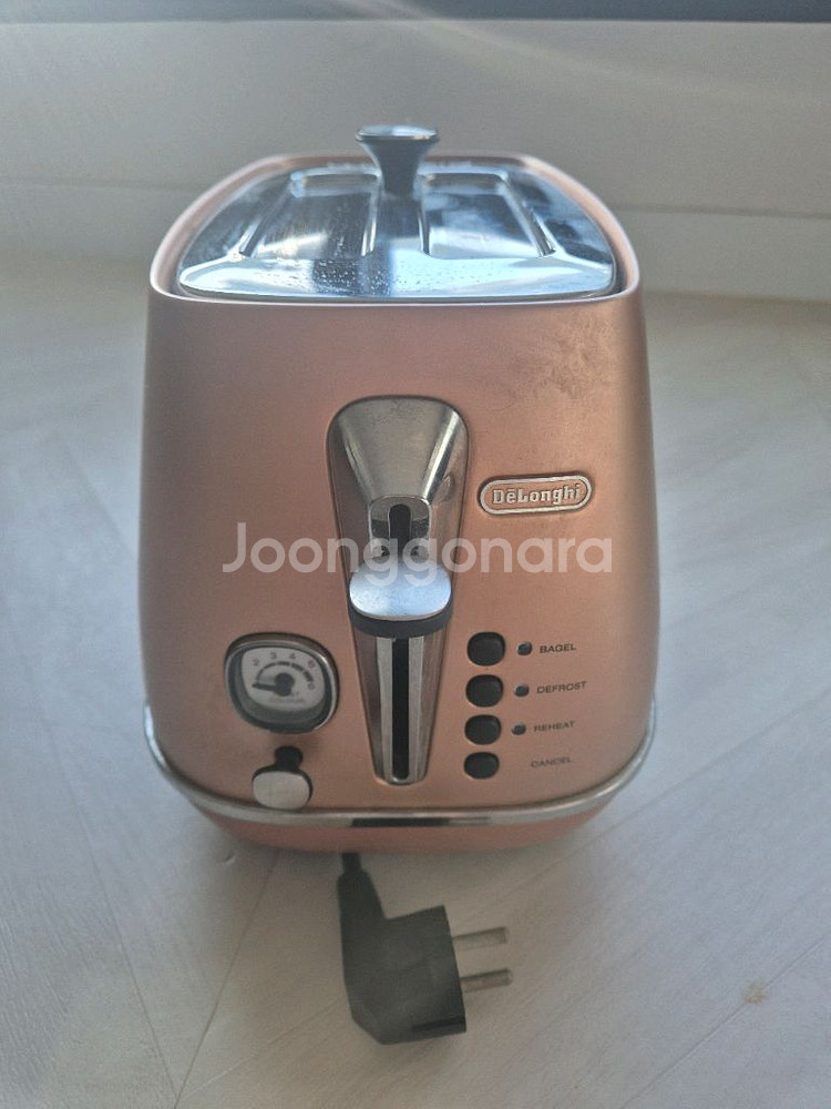 드롱기 CTI2003 로즈골드 토스터기입니다. 빵 굽기 정도를 조절할 수 있는 다이얼이 달려있습니다. 사용감 사진 확인부탁드립니다
