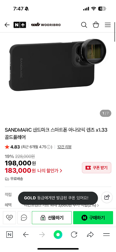 SANDMARC 샌드마크 스마트폰 아나모픽 렌즈 x1.33 골드 플레이어입니다. 아이폰 15프로 폰 케이스 같이 드려요. 사용감은 조금 있어 보이지만 2회 사용했습니다. 박스는 없고 전용 파우치가 있습니다.