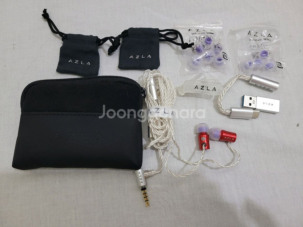 아즈라 AZEL-G 다코타 RED 이어폰입니다. 구성품은 사진과 같습니다: - 이어폰 본체 - 다양한 사이즈의 이어팁 (SS, S, M) - 파우치 2개 - USB 어댑터 실사용은 5회미만 깨끗합니다 택포