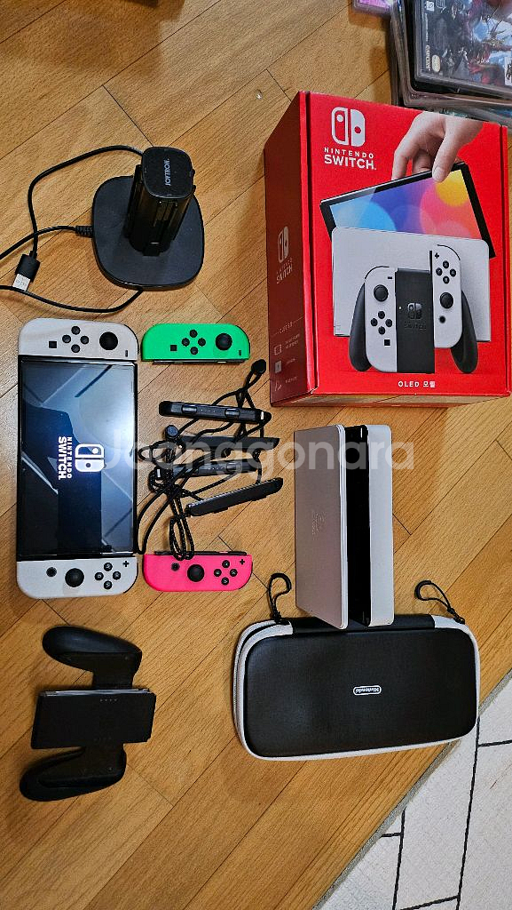닌텐도 스위치 OLED 모델 화이트 색상입니다 구성품은 다음과 같아요: - 스위치 본체 (OLED) - 조이콘 화이트, 조이콘 그린, 핑크 - 독 - Joy-Con 4구 충전 거치대 (브랜드: JOYTRON) - 휴대용 파우치 - 박스 포함 게임 칩 판매 젤다의 전설 왕국의 눈물 - 45000원 마리오카트 8 디럭스 - 40000원 마리오파티 슈퍼스타즈 - 45000원 별의 커비 디스커버리 - 45000원 몬스터 헌터 라이즈(합본 케이스가 있으나 선브레이크 칩을 잃어버림) - 45000원 스위치와 같이 게임 칩 3개 이상 구매 시 게임 하나에 5000원씩 깎아드리겠습니다. 1차 구매자이고 문제 없이 깨끗합니다. 충전기 제외 모든 구성품 있습니다. 원하시면 c타입 충전기 같이 드려요. 파우치, 조이트론 조이콘 4구 충전기도 함께 드립니다. 포스코 사거리, 선릉역, 삼성역에서 거래 가능하고 쿨거래 기준 가까운 곳까지는 차로 가드릴 수 있습니다.