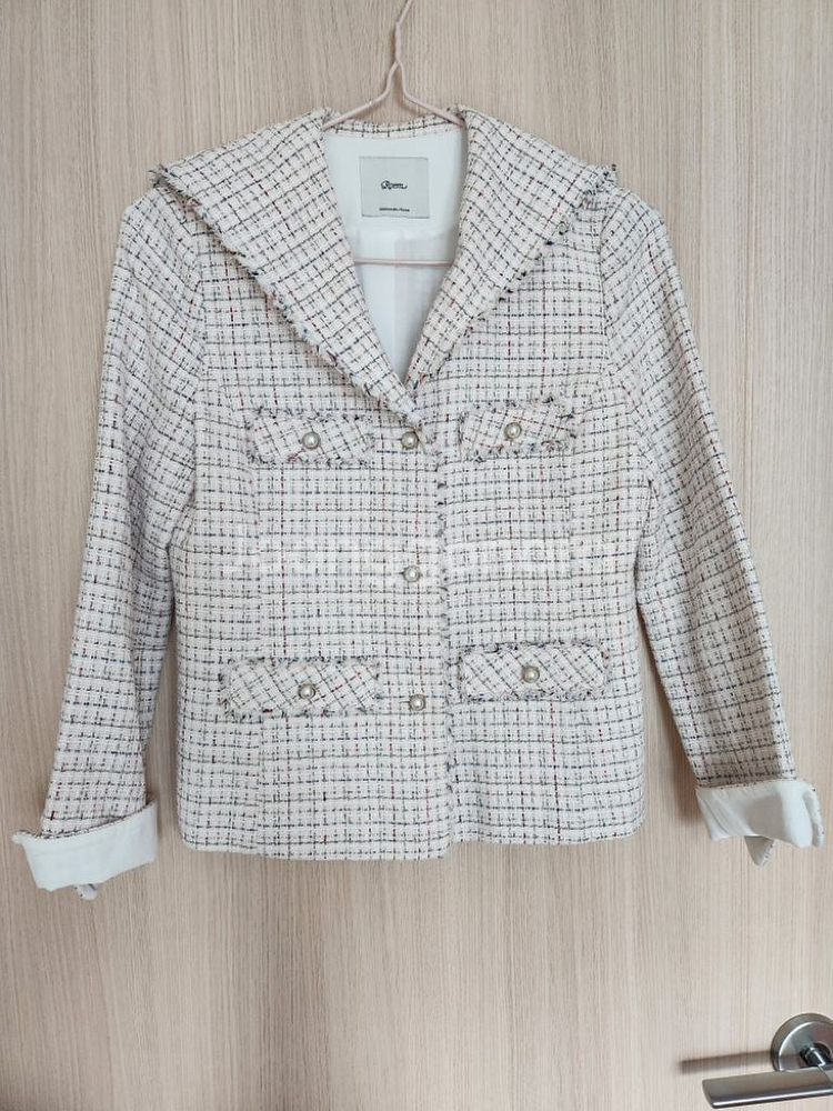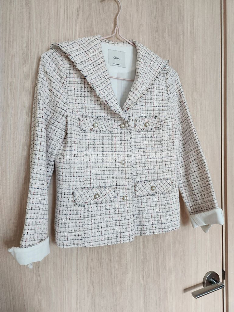 사이즈 : 가슴둘레85cm, 엉덩이둘레95cm 겉감 : 면77% 폴리에스터23% 우아하고 단정하면서도 여성스러움이 느껴지는 흰색트위드재킷이에요 소재가 굵은실원사 느낌의 트위드쟈켓으로 두껍지 않고 얇은편이에요 진주단추가 포인트로 보기보다 착용샷이 더 예뻐요~ 안에 블라우스나 긴팔티 입고 오픈해서 입어도 좋아요~♡ 청바지, 면바지, 치마에도 다 잘 어울리는편입니다 * 근처이시면 대면 거래도 괜찮고, 비대면 문고리 가능해요 * GS, CU 근처 편의점으로 반값택배나 집으로 일반택배도(3800원예상) 가능하답니다