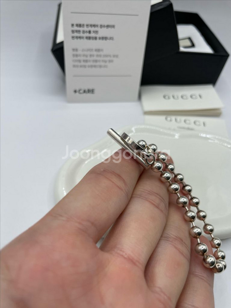 구찌 (GUCCI) (이 제품은 정품 감정서가 포함된 가격입니다) ● 상품 정보 - 제품명: 구찌 볼 체인 팔찌 602707 - 브랜드: 구찌 (GUCCI) - 모델번호: 602707 - 제조국: 이탈리아 - 등급: A - 컬러: 실버 - 사이즈(실측): 총 길이 17.4cm - 구성품: 본품,보증서,박스,더스트백 ● 정가: 약 40만원대 ● 정품 인증 포인트 구찌 (GUCCI) 이 제품은 아래와 같은 정품 기준을 모두 충족합니다. - 925(실버), 750/585(골드) 표시 선명하고 일정한 각인 - GG 패턴 대칭/간격 정확, 번짐 없음 - GUCCI 각인 & 코팅 균일 ● 등급 정보 - S : 새상품급 (미사용 수준) - A+ : 전시품 수준, 극히 미세한 사용감 - A : 전체적으로 깨끗, 가벼운 사용감 - B+ : 사용감 있으나 상태 양호 - B : 스크래치/마모 존재, 합리적 가격 ● 구매 전 안내 - 모든 상품은 전문 명품 검수팀을 거쳐 입고됩니다. - 가품 판정 시 전액 환불을 보장합니다. - 중고 특성상 사진에 보이지 않는 사용감이 있을 수 있습니다. - 실측 사이즈는 ±1~2cm 오차가 발생할 수 있습니다. - 발송: 결제일 기준 당일 (출장시 영업일 2일 이내) 네고는 거의 안받습니다 양심없게 네고하는분들이 너무 많아서요~! 직거래 원하시면 위치는 용두동 신동아아파트 정문에서 하고있구요 택배 배송 원하시면 당일에 바로 배송해드려요~!