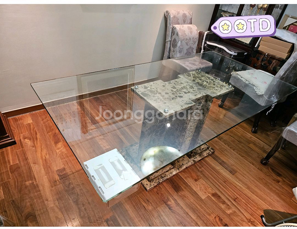 두꺼운 유리상판과 밑에 엄청 큰 통 대리석 식탁입니다. 아주 세련되고 어느 인테리어와도 잘 어울려요. 저 대리석 받침이 통이라 무거워요. 식탁의자 6개는 몇개월전 천갈이 비용만 80만원 들었는데 빨리 처분하려고 싸게 당근합니다. 사이즈 사진에 있어요. (수입가구점에서 이태리제라고 했는데 아닌것 같아요.) 종로구에서 픽업하셔야 해요. 세로200cm x 가로100cm x높이77cm