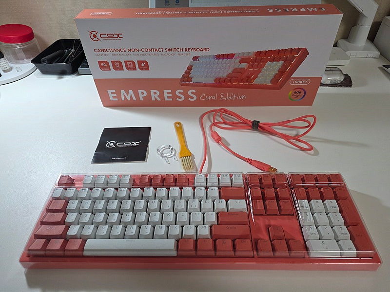 콕스 엠프리스 노뿌 무접점 50g 리빙코랄 에디션 제품으로 따로 윤활 작업진행하였습니다. 순정제품에 비해 타건 시 부드럽고 노뿌의 매력을 최대한 느낄 수 있는 50g에 윤활 되어있다보니 타건감이 정말 좋습니다. 또한 타건음도 정갈해지다보니 도각거림과 보글거리는 소리가 은은하게 들립니다. 25년 7월 28일 키보드 내, 외부 청소 및 키캡 및 슬라이더 세척(중성세제) 완료하였으며, 이후 29일 모든 키 슬라이더에 크라이톡스 105로 윤활하였습니다. 또한 GLP205 G2구리스로 스태빌 철쇠 부분 작업해두었으며, 키캡과 키보드 결합 시 철쇠와 연결하는 걸쇠부분에 Super Lube 구리스로 작업해두어 타건 시 발생하는 철심소리를 잡아두었습니다. 해당제품은 RGB 기능이 있는 모델입니다.(RGB OFF도 가능) 사무용 및 게이밍용으로도 많이들 찾고 있는 제품입니다! 윤활 작업 이후에는 사용하지 않고 보관하고 있습니다. 풀박스 구성입니다. 실사용 기간은 몇개월 안된 제품입니다.(키캡 상태나 외관 상태보시면 깨끗합니다.) 직거래는 수원역에서 진행하며, 수원역 인근에서도 협의하에 진행가능합니다. 거래이력 많으니 안심하시고 편안하게 거래하세요! 010 9307 47둘둘 문자부탁드립니다. 감사합니다 :)