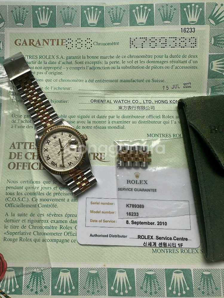 롤렉스 데이트저스트 16233 (2002년식 / K넘버) 판매합니다. 모델명 : Rolex Datejust 16233 연식 : 2002년식 (K 넘버) 구성품 : 마지막 사진구성 상태 : 생활 사용감 거의 없으며, 금고 보관으로 컨디션 매우 양호합니다. 무브먼트 : 자동 (정상 작동, 시간 오차 없음) 시계가 매우 빛나고 , 고급스러우면서 클래식한 디자인으로 , 평생 소장할 만한 가치 있는 시계입니다.
