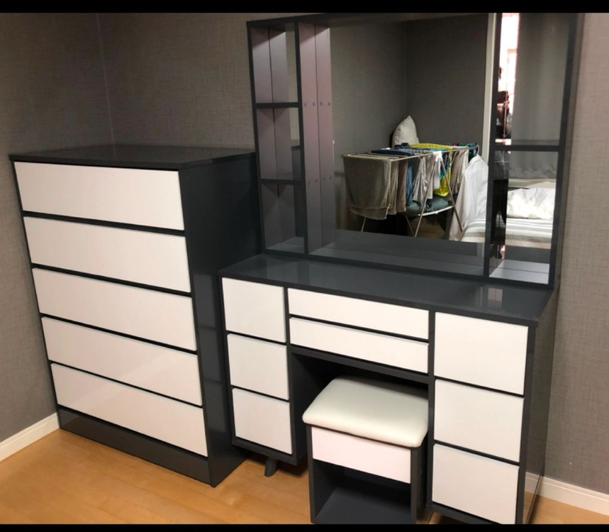 하이그로시 수납 화장대 - 사이즈: 1100x400x1435mm (화장대), 1100x130x850mm (거울) - 색상: 화이트, 그레이+화이트 수납공간도 넉넉하고 의자에도 수납공간 있어서 진짜 잡동사니 많이 들어갔어요! 상태 괜찮아요~ 깨끗하게 썼구요, 거의 수납장용으로만 사용해서 화장 스툴에 앉아본적이 손에 꼽네요 안에 서랍들 다 닦아두었어요~ 하이그로시 5단 광폭 서랍장 - 사이즈: 가로 900 * 세로 500 * 높이 1230mm - 하단 비밀서랍: 가로 812 * 세로 425 * 높이 45mm - 큰 서랍 한 칸: 가로 812 * 세로 425 * 높이 145mm 서랍장 넓고 튼튼해서 좋아요 하이그로시 재질이라 때탐 없이 깨끗하게 3년 썼어요~ 밑에 히든? 서랍 있어서 중요한 귀중품은 거기에 숨겨둘수 있어 좋았어요ㅎ 3년 정도 사용했구요 구매하고 이사한적 없어 큰 하자는 없으나 아무래도 생활 기스정도는 있을거같아요~ 직접 가져가셔야 되요~ 금호 4가동입니다 엘베 있는 아파트입니다