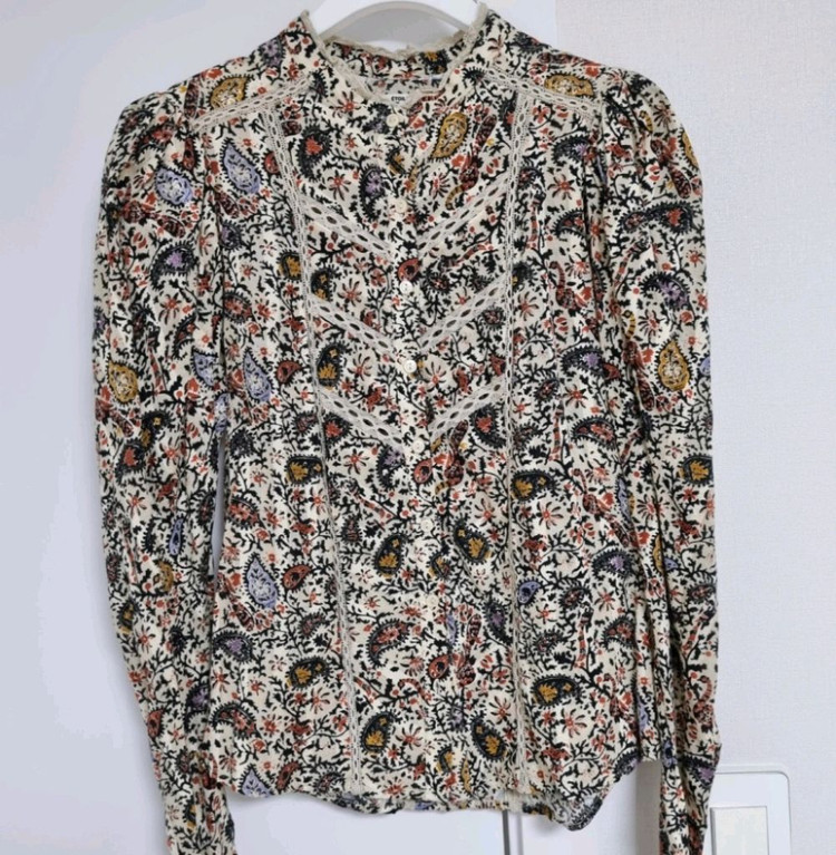 사이즈 34 고혹적인 블라우스에요. 아껴입느라 몇번 못입었어요. 출산후에 사이즈가 바뀌어서 보냅니다.
