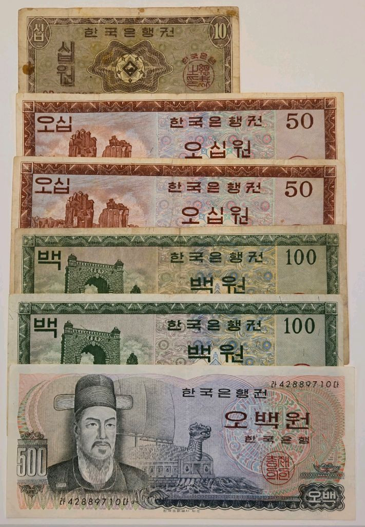 옛날 돈 팝니다 일괄로 우선 판매합니다 순서대로 영제 10원 얼룩이 많습니다 영제 50원 두 장 모두 EA로 시작하는 초판입니다 큰 차이는 없지만 하쪽이 더 누렇습니다 영제 100원 하나는 깨끗한 편이고 하나는 좀 누렇습니다 이순신 500원 이 중에 상태는 제일 좋네요 직거래 서울 공릉역 태릉입구역 남양주 수동면 택배 불가