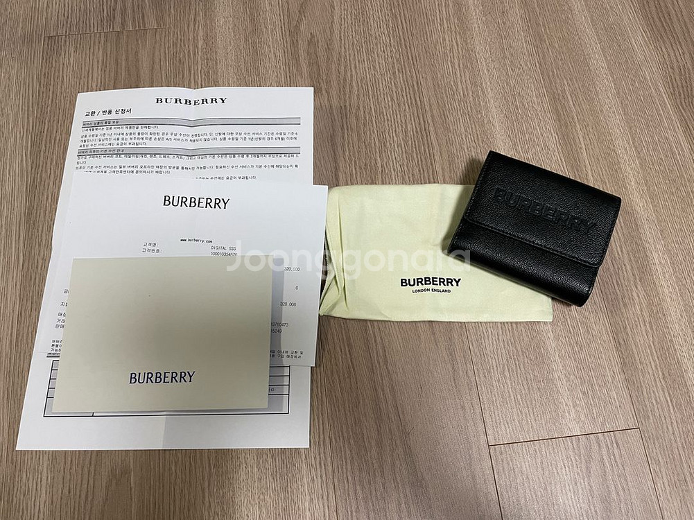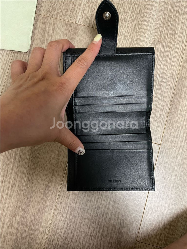 버버리 반지갑 검정입니다 겉상태 좋고 내부에 미세오염 한군데 있어요 카드는 6칸 지폐는 한칸 뒤집어서 동전넣는곳 있어요 똑딱이구요 실제크기는 가로 11센치 세로10센치 정품인증할만한 영수증은 따로 없고 백화점몰에서 구매 구입당시 영수증 첨부합니다 보시고 판단해주세요 택배가능 환불불가