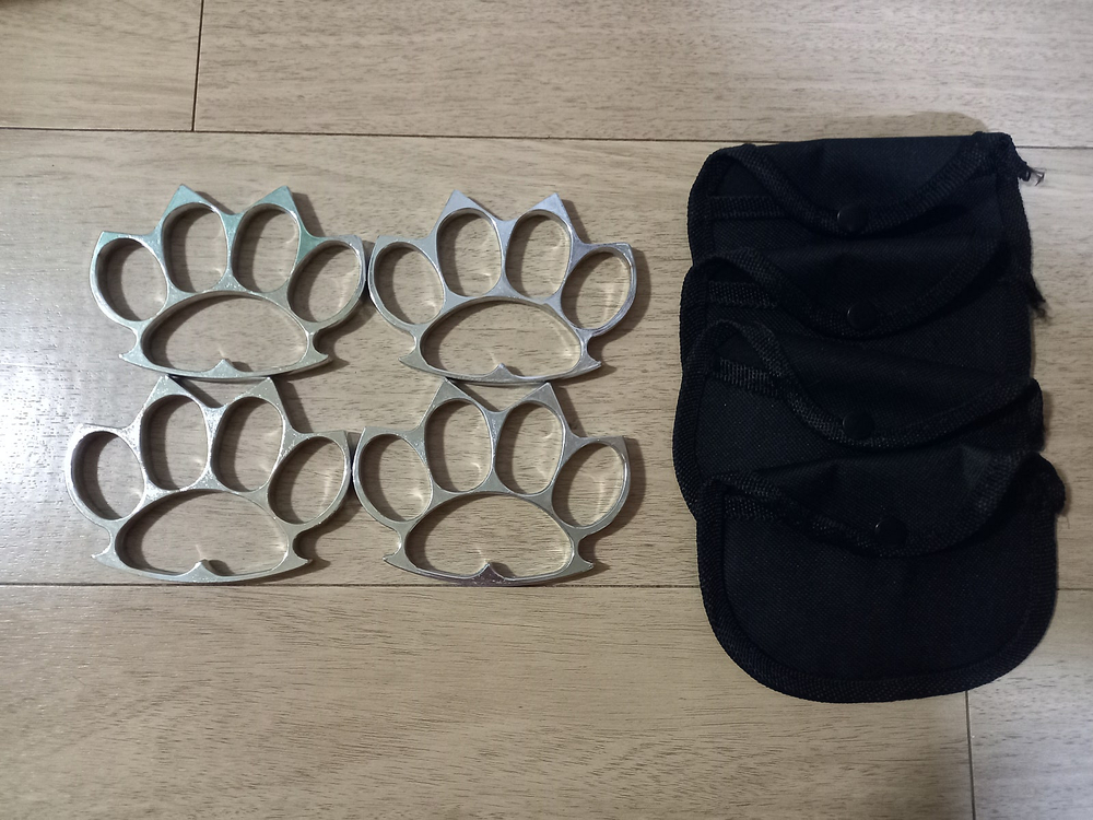 = = 단종된 저가호신용 너클더스터팝니다. 무기둔기호신술운동수련 주의! 절대로 밖에서 휴대하거나 사람을 향해 사용하지 마세요! 특수폭행 및 큰 중범죄에 처해질 수 있습니다. 집에서 소장용이나 수련용으로만 사용하세요! 시중에도 다양하게 판매하는 너클이기에 판매하는 것이고 구매자가 법적문제시 판매자는 책임지지 않습니다. 성숙한 마음과 정신으로 구입하시기 바랍니다. 2. 은색 얇은 너클 더스터 2개 한쌍 구입한지 오래된 너클팝니다. 손이 좀 크신분들 추천합니다. 사진에 보이시는 파우치는 한개당 한개입니다. 두개가 안들어가네요.;; 서비스겸 드립니다. 제조과정에서 흠집이나 잡티는 불량이 아닙니다. 2개 한쌍 [6000원] 4개 두쌍 [12000원] = = ========================================================= = = ★택배비절감 문제때문에 10000원 이상부터만 거래합니다!! 양해바랍니다. = = ■여러가지사정으로 인해 "택배거래만" 합니다. 거주지가 많이가깝거나 특별한경우가 아니면 직거래는 가급적 하지않습니다. 이 부분 너그러히 양해해주세요. 택배사는 포스트박스 편의점택배 CJ대한통운을 이용합니다. 배송비: 선불 4000원 부터이며, 무게에 따라 달라집니다. 접수후에는 운송장번호를 문자로 드립니다. 이외의 문의사항은 문자로 부탁드립니다. 중고나라앱은 사용하지 않으니 가능한 답글이나 문자로 부탁드립니다. H: 010-9161-1757 = = ==========================================================