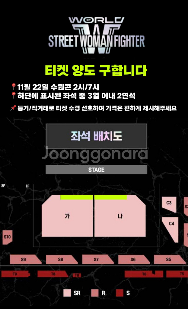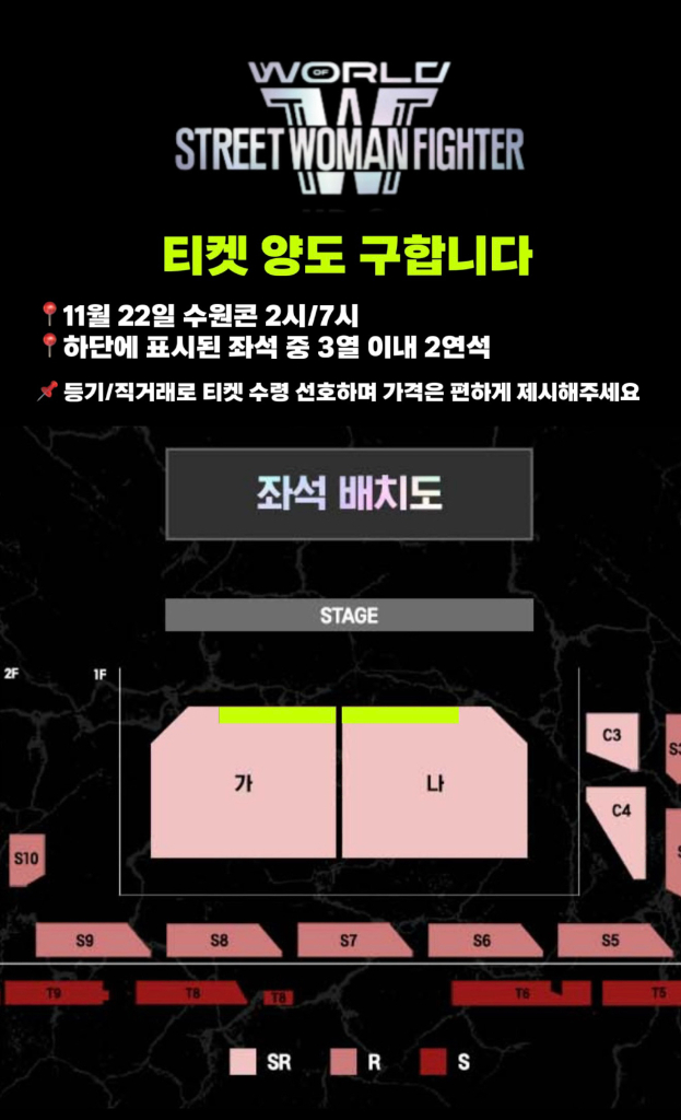 개인정보(거래정보)를 주고받는 행위는 사기에 노출될 수 있으므로 즉시 중고나라로 신고해 주세요스우파 수원 콘서트 티켓 양도 구합니다. 📍11월 22일 오후 2시/7시 수원 콘서트 📍사진에 표시된 좌석 중 3열이내 2연석 🚨티켓 수령 이후 직거래(수도권 무관) 혹은 등기 발송 💚가격 편하게 제시해주세요💚