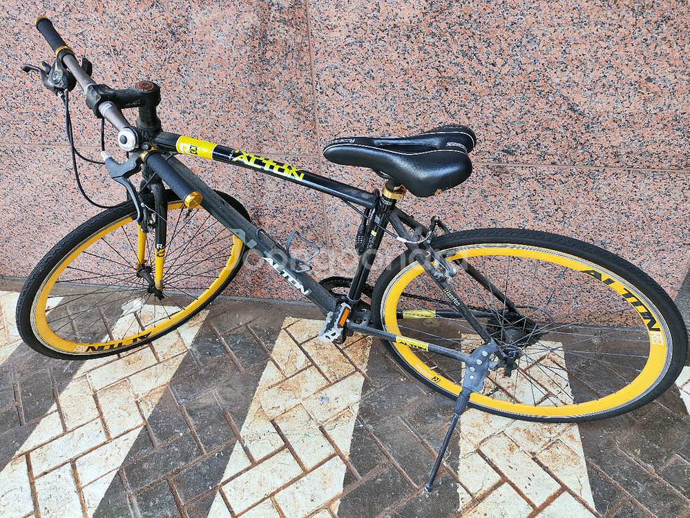 알톤 알루미늄 하이브리드 자전거입니다. 검은색 프레임에 노란색 휠이 포인트입니다. 얼마전 타이어 앞뒤, 손잡이 양쪽. 다 새걸로 교체 했습니다. 브레이크도 점검했고 바로 타면 됩니다. 알루미늄이라 녹이 쓸지 않아 관리하기 좋습니다. 생활감 있는 중고 제품입니다. 직거래는 서울서부경찰서 앞입니다.