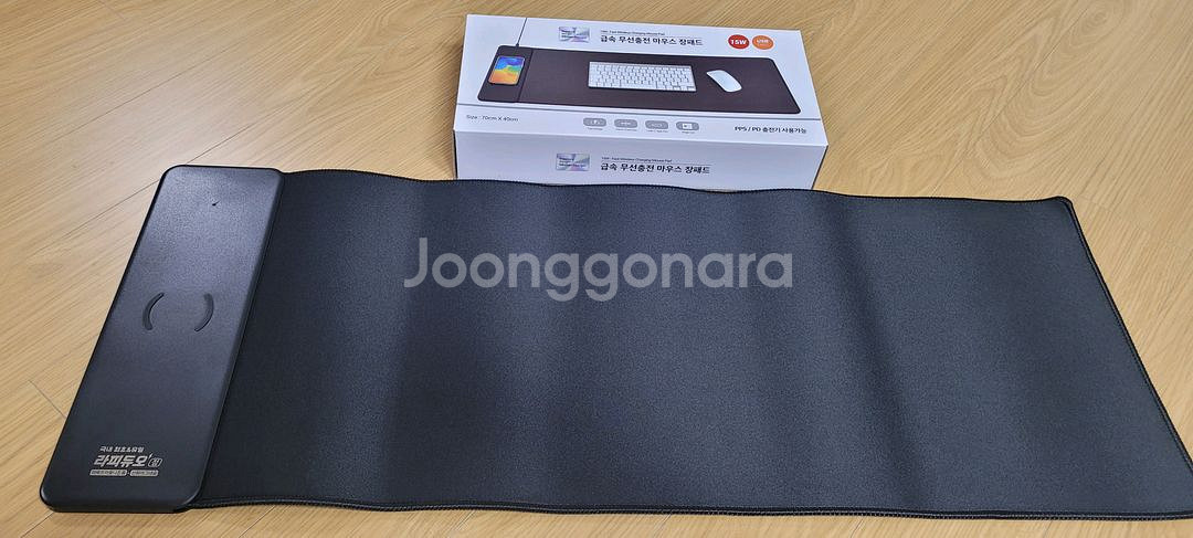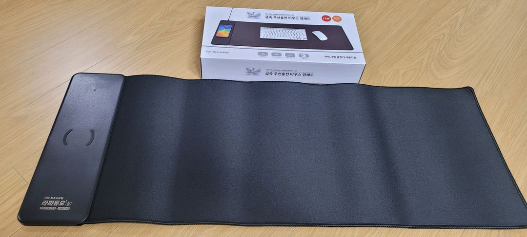새상품 라피듀오 금속 무선충전 마우스 장패드입니다. 휴대폰 무선 충전하면서 마우스 패드로 사용 가능합니다. 넉넉한 사이즈로 키보드까지 올려놓고 쓸 수 있습니다.