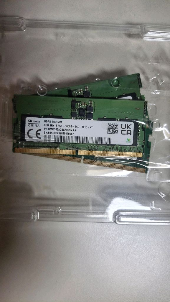 노트북용 SK하이닉스와 DDR5-5600 8GB 램 RAM 모듈입니다. 새상품이며 한번도 사용하지 않았습니다 재고상태 : - SK하이닉스 DDR5 8GB 5600MHz 1개 15000원 노트북 업그레이드나 교체용으로 좋아요