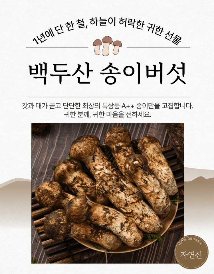 🌲백두산의 정기를 품은🌲 🌲살아있는 향🌲 당일 채취 명품 송이버섯 오늘 새벽, 청정 자연의 이슬을 머금고 나온 바로 그 송이를 내일 당신의 식탁 위에서 만나보세요. ✨ 지금이 아니면 1년을 기다려야 합니다! ✨ POINT CHECK! ✔️ 당일 채취, 당일 발송으로 갓 채취한 신선함 그대로! ✔️ 30년 전문가의 까다로운 선별로 믿을 수 있는 A급 품질! ✔️ 산지 직송 시스템으로 유통 거품을 뺀 합리적인 가격! ✔️ 정직한 등급 판매로 속이지 않는 정직함으로 믿음을 드립니다! 타업체와 달리 다른 지역의 송이버섯과 절때 섞지 않습니다. 100% 백두산 청정지역에서 채취한 최상급 북방 자연산 송이버섯만 정직하게 판매합니다. 🚚 배송 안내 [포장] 아이스박스에 동봉하여 신선함을 유지한 상태로 보내드립니다. [택배사] 가장 안전하고 빠른 택배사로 선택하여 발송됩니다. [발송일] 오후 2시 이전 주문 시 당일 발송을 원칙으로 합니다. (주말/공휴일 제외) [주의] 신선식품 특성상 단순 변심에 의한 교환/환불은 어려운 점 양해 부탁드립니다.
