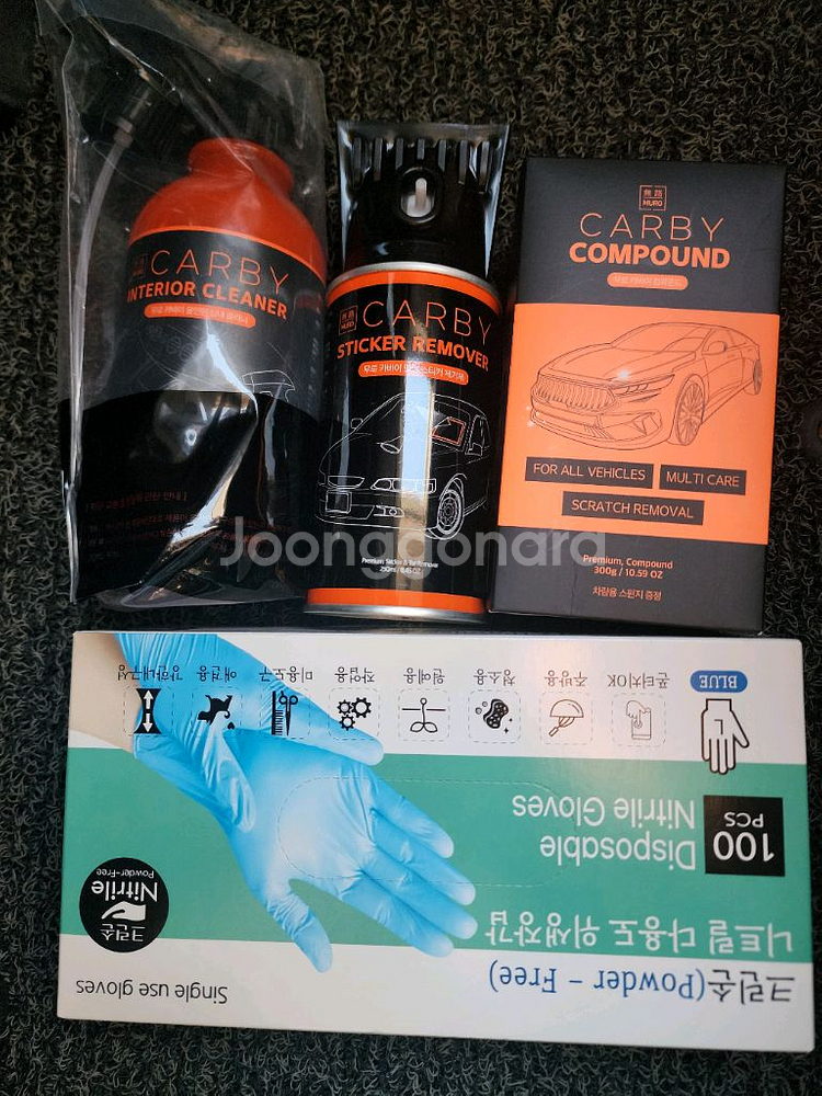 개인정보(거래정보)를 주고받는 행위는 사기에 노출될 수 있으므로 즉시 중고나라로 신고해 주세요CARBY 차량용품 3종 세트입니다 - 스티커 제거제 - 실내 클리너 - 컴파운드 - 라텍스 장갑 L(100pcs)