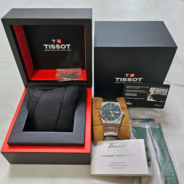 ㅁ티쏘 prx 그린 40mm 파워매틱 - 25년 1월 구매 - 실 착용횟수 약 10회 - 그린모델이나 조명에 따라 블랙처럼 보이기도 함 - 다이얼과 어울리는 초록색 가죽스트랩 증정 - 스트랩에 생활 기스가 있으나 여분코 5개로 새것처럼 사용가능 - 손목둘레 16.5cm에 맞게 줄 줄여져있음 시계를 많이 갖고있어 실 사용이 적고, 시계 함에 보관되어있어서 상태가 좋습니다. 직거래 원동입니다 네고문의는 받지않습니다 택배거래 시 택배비는 제가 부담합니다